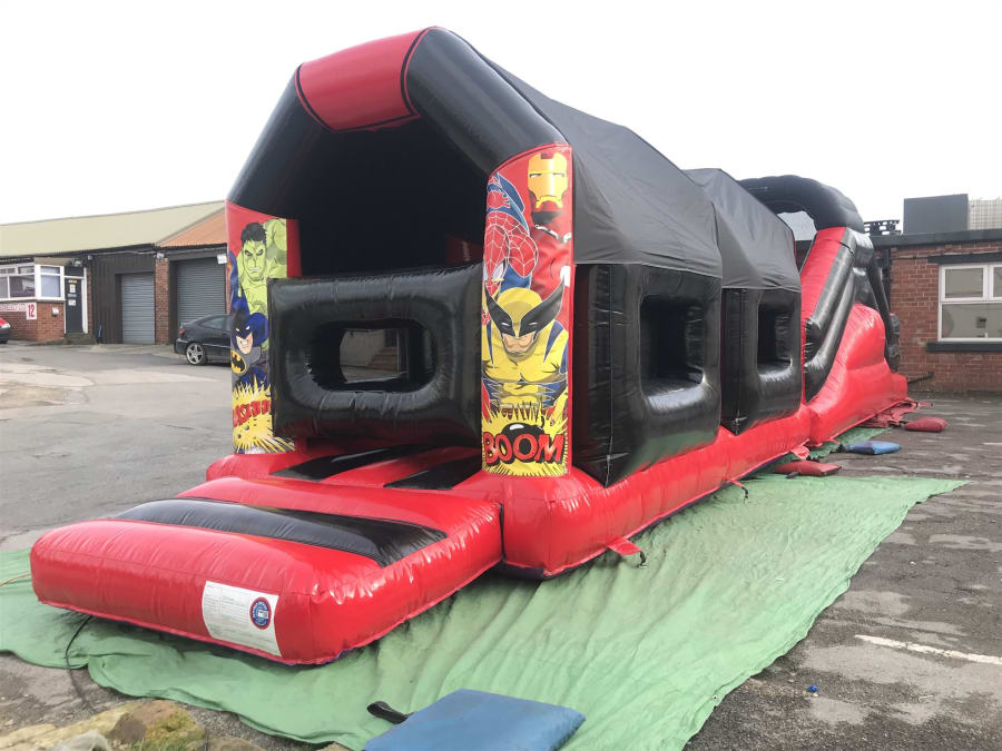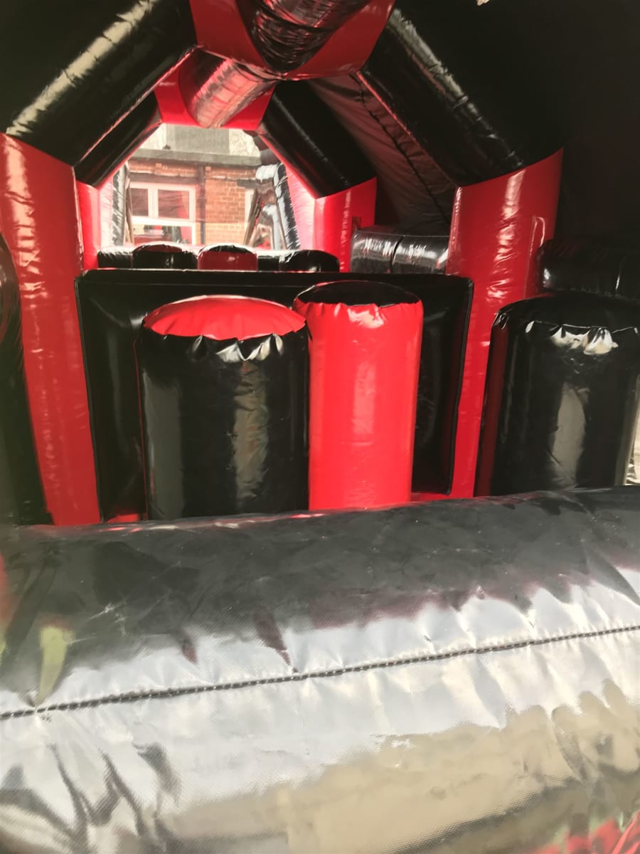 Wow wow wow this is the daddy of any assault courses 50ft in length gloss black & red climb your way though the letter box into the bish bash pillars where you will find yourself climbing through the bish bash and into another climb through letterbox through the second set of bish bash pillars into the slide compartment up the ladders down the slide and back to the begginging to have hours and hours of fun but wait that’s not all ! This is a rare disco assault course which means you can have your very own music played inside the assault course the Bluetooth system connects to any Bluetooth device so you can play music straight from your device inside the inflatable assault course with all the multi coloured laser lights this will be the party of all party’s !! You can also pick you theme I.e super hero’s , Disney princess plus many more please ask upon booking if we have your theme available. the inflatable will be fully set up and safety checked by our trained staff upon arrival.
