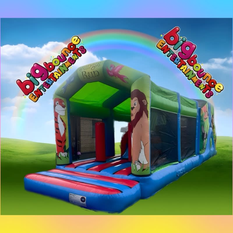 The Jungle themed inflatable obstacle course for hire measure in at whopping 50ft in length yet is perfect for both indoor and outdoor hire. 50ft is a brilliant length making it suitable for most domestic parties, pubs, clubs, schools, galas, scouts, cubs, guides and other community groups aiming to keep children entertained for longer periods of time than the standard bouncy castle for example, making it perfect for your little monkeys.