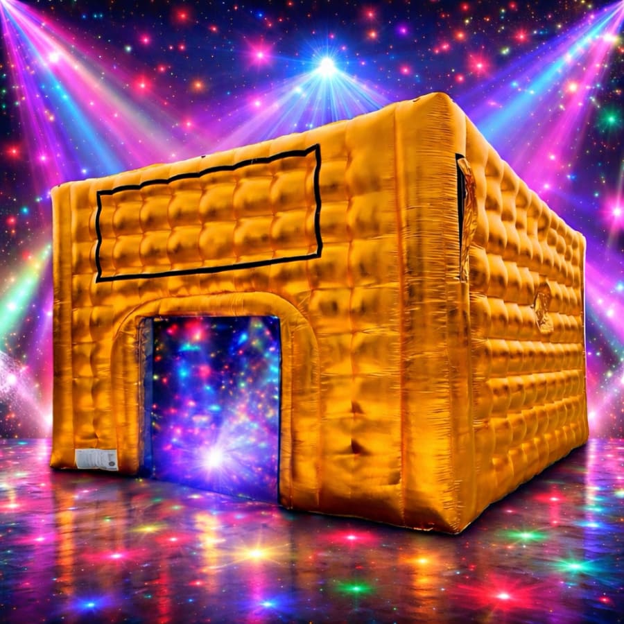 Nightclub hire Gold rave nightclub #16x16ft & in Dewsbury, Leeds, Bradford & throughout West Yorkshire — bring festival-grade energy to any event. This gold inflatable nightclub creates an immersive, high-energy party space. It’s 16ft x 16ft with an 11.9ft peak. The dome holds a full dance floor. Guests see, hear, and feel a real nightclub atmosphere. Perfect for birthdays, DJ sets, and private raves. 🔊💃