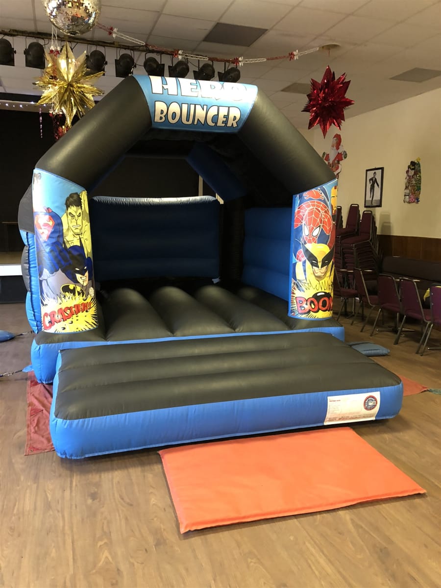 perfect bouncy castle for any super hero fan with all the super here characters on the front pillars this hero bouncer will make many little or big boy very happy on that special day !