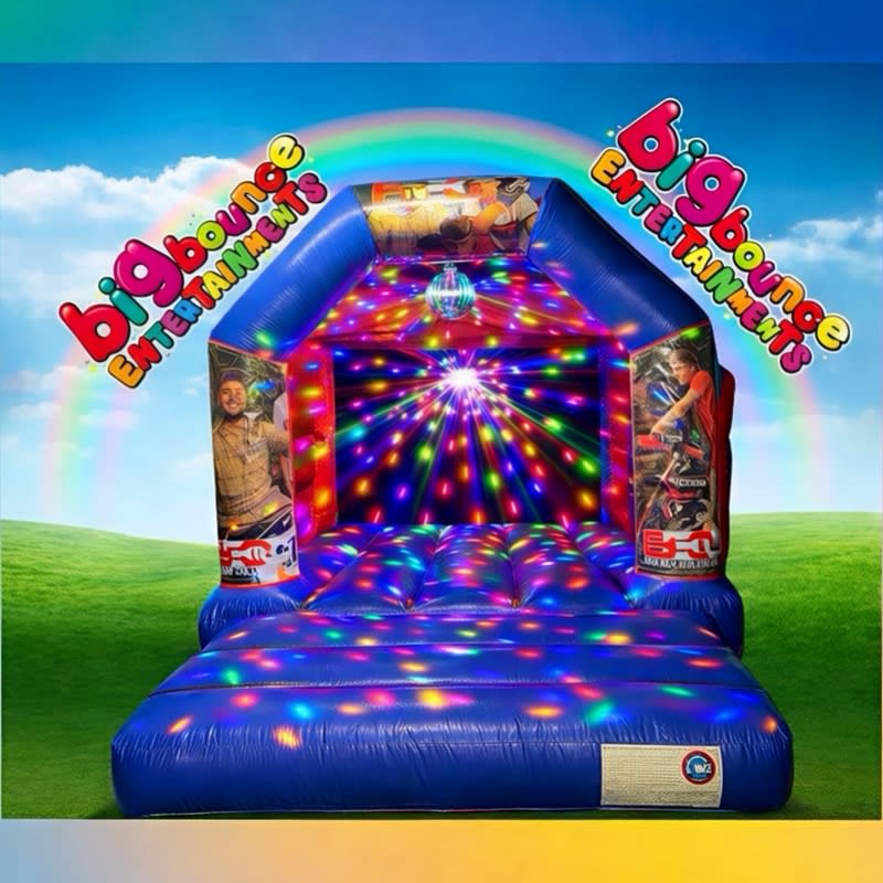 wow here it is new for 2022 ! the only company in the west to have a bbcc disco castle !! In blue and red & we also have it in pink and purple. These guys have smashed the scenes and become the next big boy band, you can play your very own bbcc music directly into the Bluetooth sound system, all while the 7 colour led disco lights go to the beat ! Please note this inflatable will be very popular we advise to book asap !