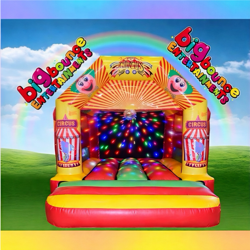 The12x15 disco Circus Bouncy Castle hire is the perfect theme for any themed party, venue or occasion. The Circus castle is a great size at only 9ft 6" tall which makes the hire ideal for both indoors and outdoor hire and will keep children entertained for hours, leaving you to be able to sit back and watch them bounce, play, laugh, have fun and enjoy their day. The Circus artwork is very realistic and fantastic quality, ensuring the perfcet party idea.