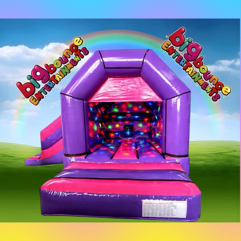 Hire our combo bouncy castle hire Disco slide combo (choose your theme) in Dewsbury, leeds, bradford, & throughout west yorkshire. This disco-themed combo puts music, lights and a slide inside one inflatable. It’s perfect for birthdays, school fairs, and family events. Fast setup. Safe play. Big impact.