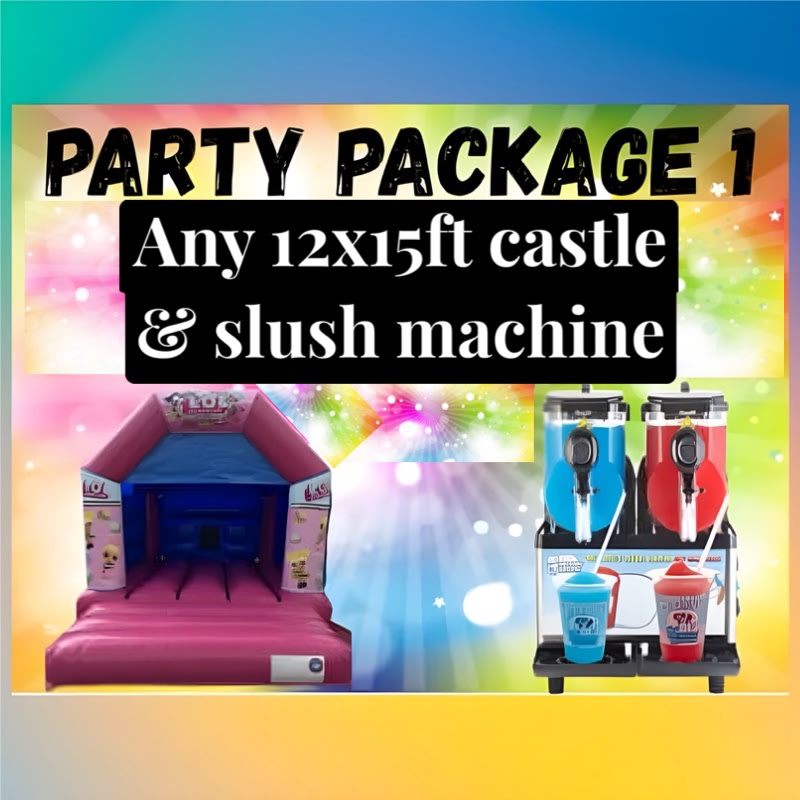 Party package 1 is a very popular package at big bounce entertainments any 11x15ft bouncy castle ( excluding disco castle ) and slush machine with 50 servings any flavour of your choice. You can book this package at this amazing price online using our live online booking system, or you can give the team a call on 07429 659400