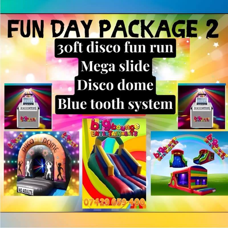 Fun day package 2 is a well put together a package to suit everyone’s needs in this package you have it all disco dome with lights and music mega slide 30ft Fun run with lights and music and also a disco Bluetooth sound system this package will surely enough get any party started please note you can change this package if there is something you don’t want please just ask.