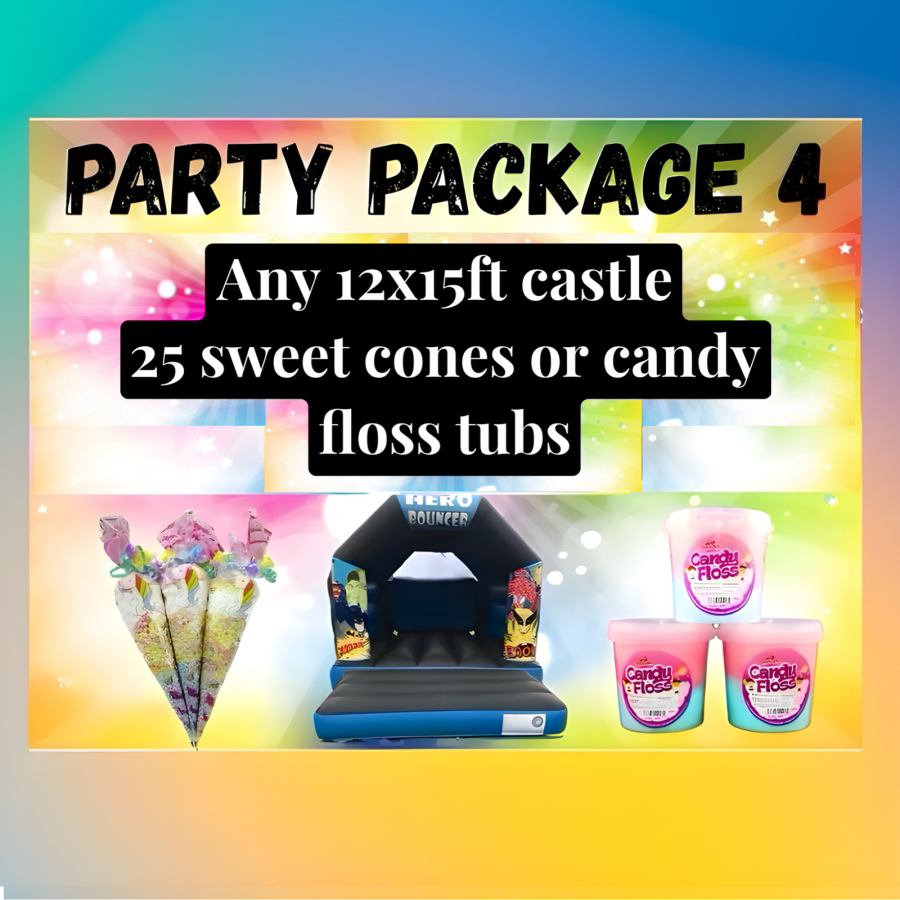 this party package is everything you need for your party you will get any themed bouncy castle, 25 sweetie cones or 25 tubs of candy floss all for an amazing price if you would like to book this package you can use the contact form or