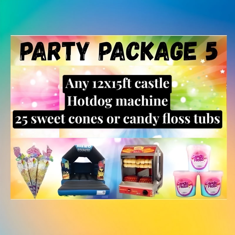 this party package is everything you need for your party you will get any themed bouncy castle, hotdog machine supplied with 50 hotdogs and buns. and 25 sweetie cones or candyfloss tubs all for an amazing price if you would like to book this package you can use the contact form or